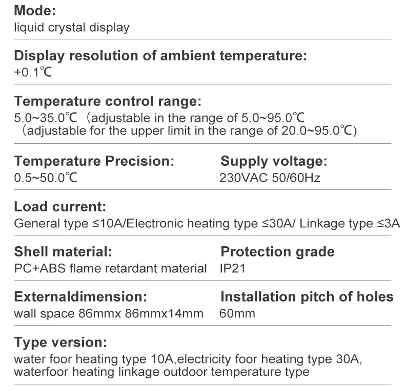 • Typeversion: water foor heating type 10A,electricity foor heating type 30Awaterfoor heating linkage outdoor temperature type