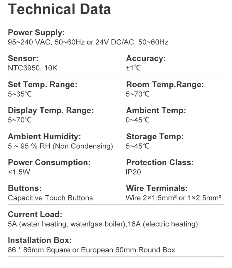 - Current Load: 5A(water heating,waterlgas boiler),16A(electric heating)