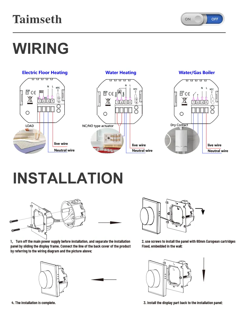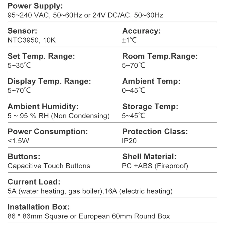 • Current Load: 5A(water heating,gas boiler),16A(electric heating)